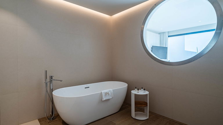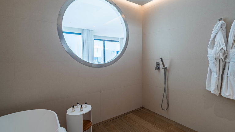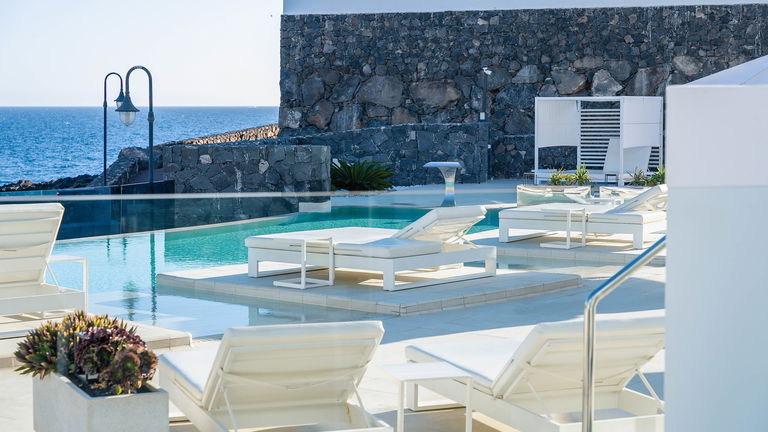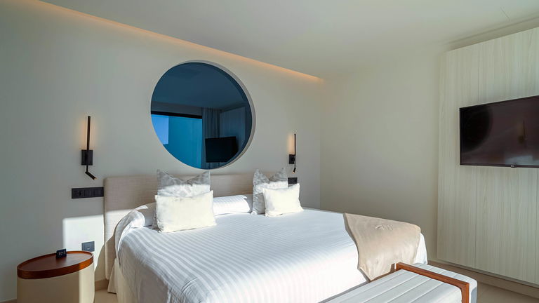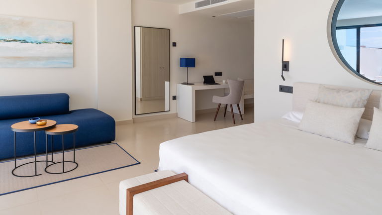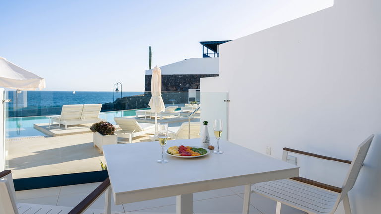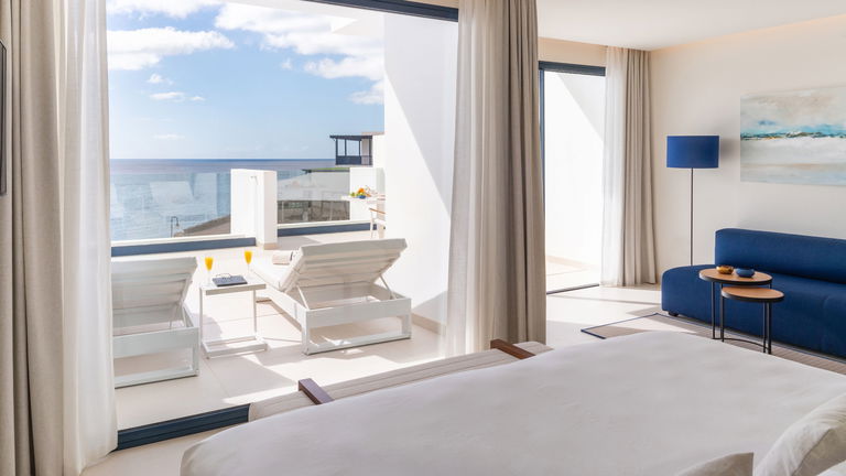 Las suites Océano, ubicadas en la primera planta del hotel, ofrecen unas maravillosas vistas al mar que se pueden contemplar incluso desde la ducha. Con 45m2, estas suites ofrecen sotfisticación, confort en cada uno de sus agradables espacios. Incluso en su terraza privada con tumbonas desde la que podrá relajarse disfrutando de las vistas abiertas al mar.