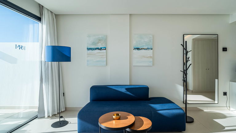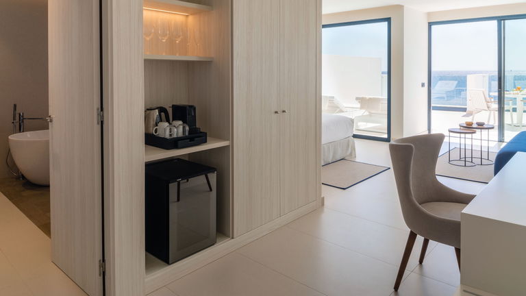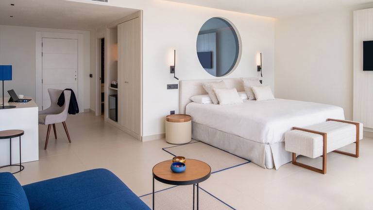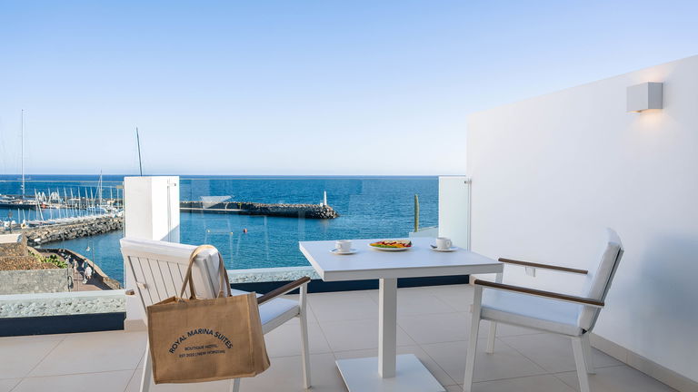 Las Suites Marina, de aproximadamente 45 m², están ubicadas en la planta baja y ofrecen acceso directo a la zona de piscina y solárium. Destacan por su diseño, comodidad y equipamiento, acompañados de fantásticas vistas a la piscina y al mar. Estas suites son ideales para aquellos que desean disfrutar de un acceso rápido a las instalaciones del hotel mientras se deleitan con las vistas.